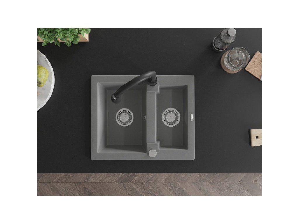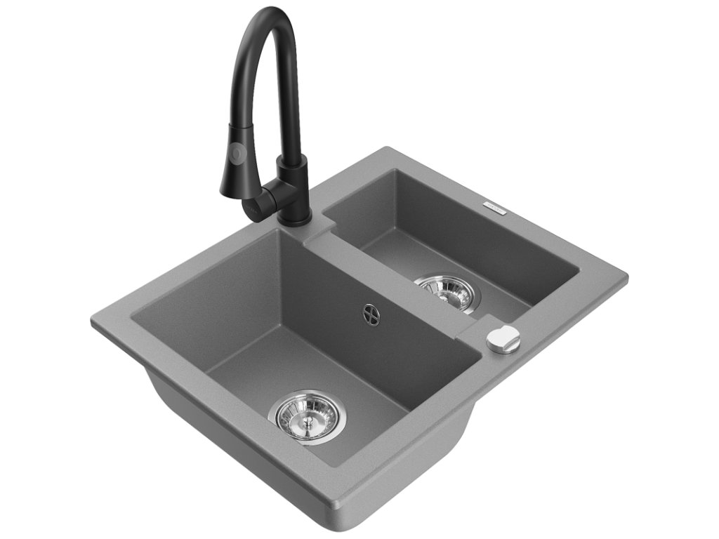 Granitový drez Mexen Carlos s 1,5 miskou a kuchynskou batériou Elia, sivý - 6518-71-670101-70