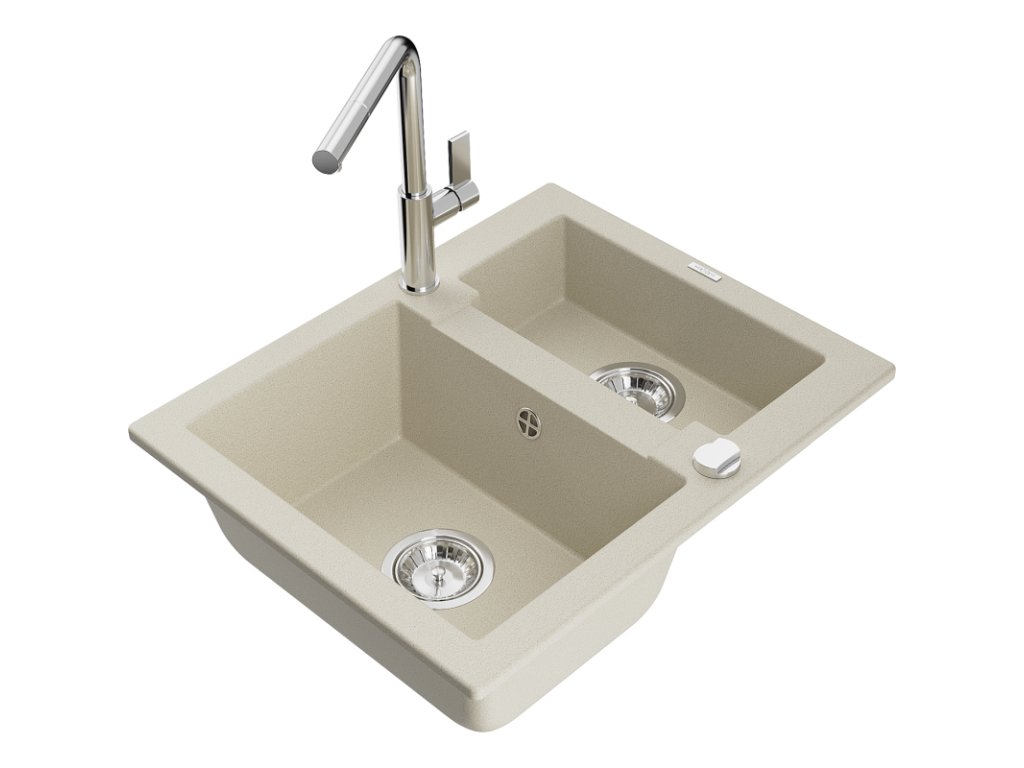 Granitový drez Mexen Carlos s 1,5 miskou a kuchynskou batériou Flora, béžový - 6518-69-670401-00