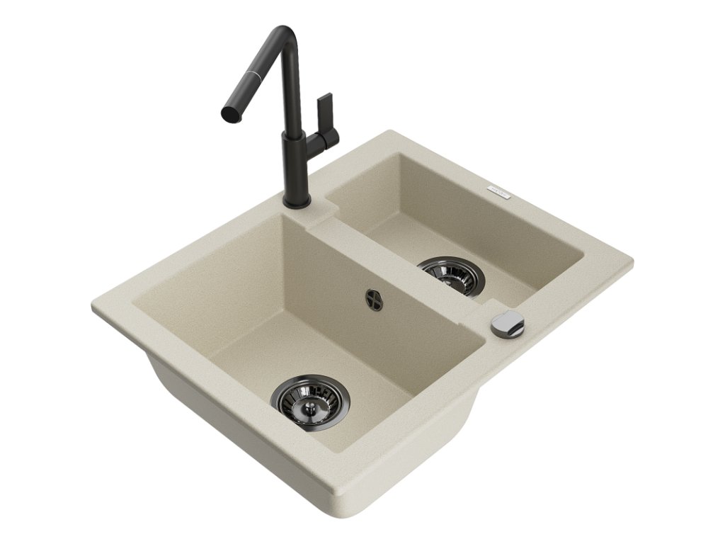 Granitový drez Mexen Carlos s 1,5 miskou a kuchynskou batériou Flora, béžový - 6518-69-670401-70-B