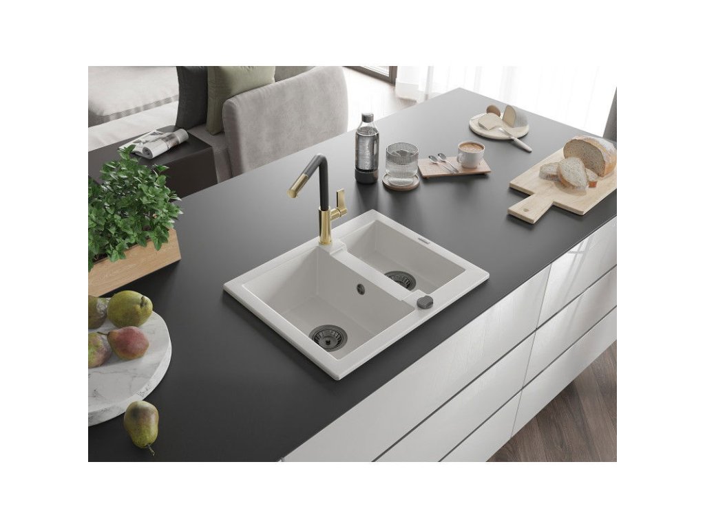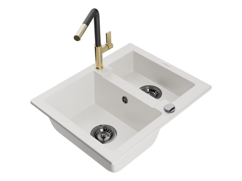 Granitový drez Mexen Carlos s 1,5 miskou a kuchynskou batériou Flora, biely - 6518-20-670401-57-B