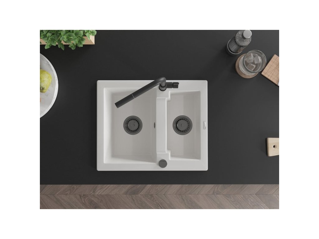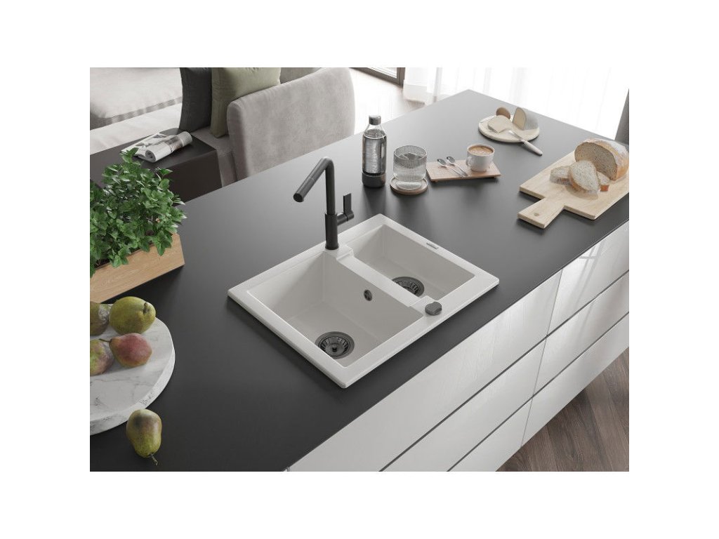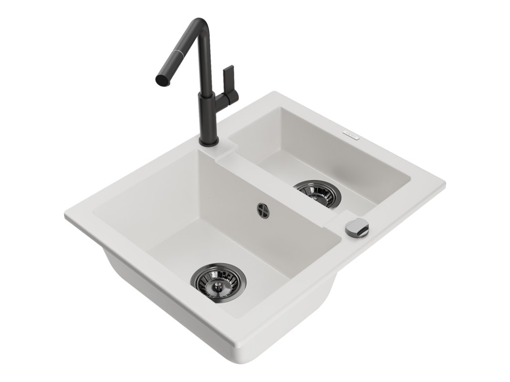 Granitový drez Mexen Carlos s 1,5 miskou a kuchynskou batériou Flora, biely - 6518-20-670401-70-B