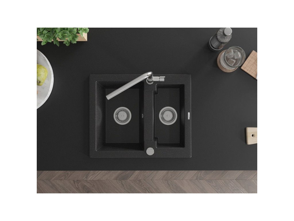 Granitový drez Mexen Carlos s 1,5 miskou a kuchynskou batériou Flora, čierna/strieborná metalíza - 6518-73-670401-00