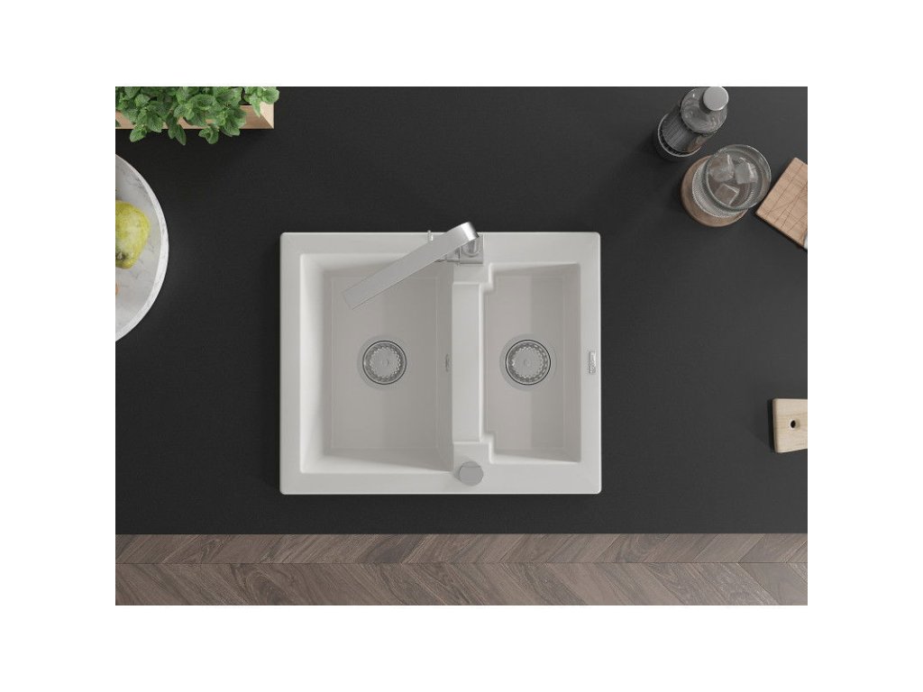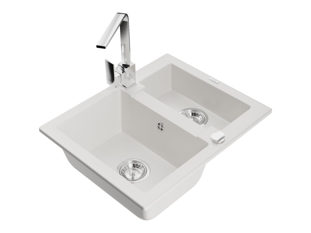 Granitový drez Mexen Carlos s 1,5 miskou a kuchynskou batériou Rita, biely - 6518-20-670300-00