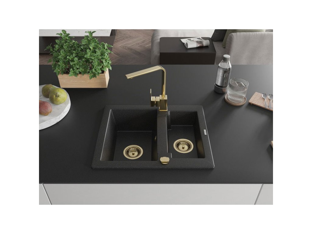 Granitový drez Mexen Carlos s 1,5 miskou a kuchynskou batériou Rita, čierna/strieborná metalíza - 6518-73-670300-50