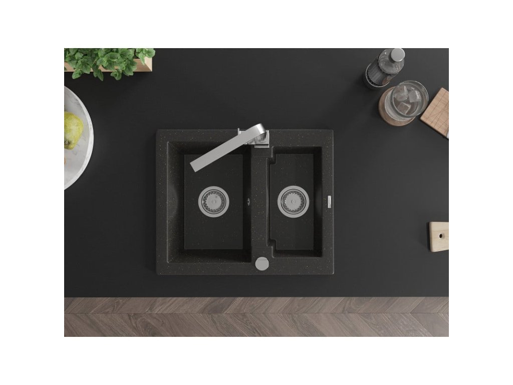 Granitový drez Mexen Carlos s 1,5 miskou a kuchynskou batériou Rita, čierna/zlatá metalíza - 6518-75-670300-00
