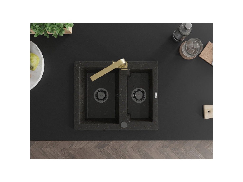 Granitový drez Mexen Carlos s 1,5 miskou a kuchynskou batériou Rita, čierna/zlatá metalíza - 6518-75-670300-50-B