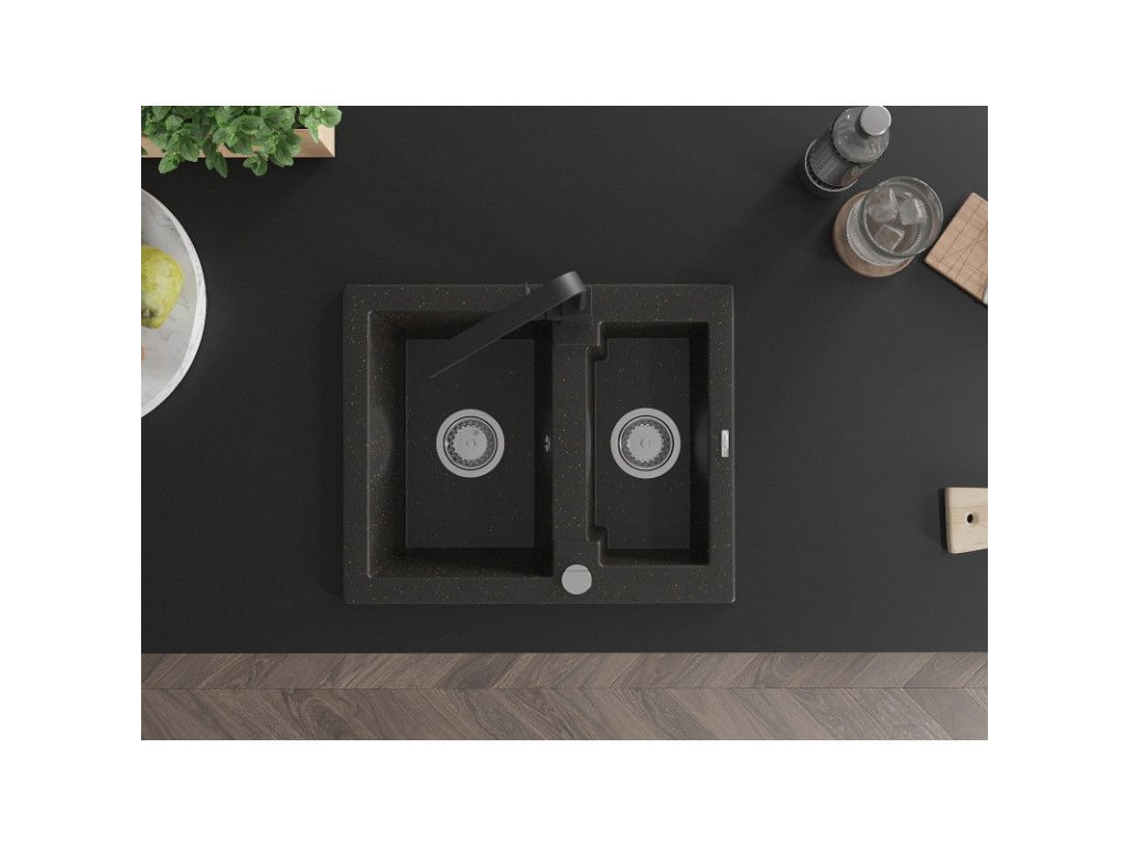Granitový drez Mexen Carlos s 1,5 miskou a kuchynskou batériou Rita, čierna/zlatá metalíza - 6518-75-670300-70