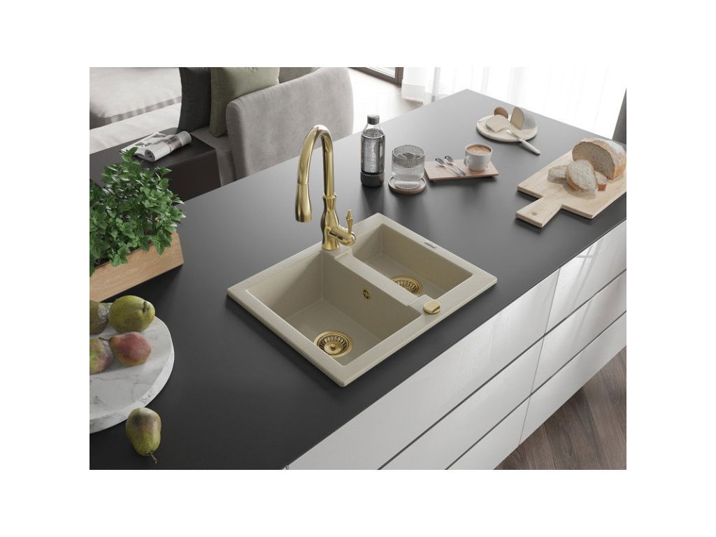 Granitový drez Mexen Carlos s 1,5 miskou a kuchynskou batériou Savita, béžový - 6518-69-672601-50