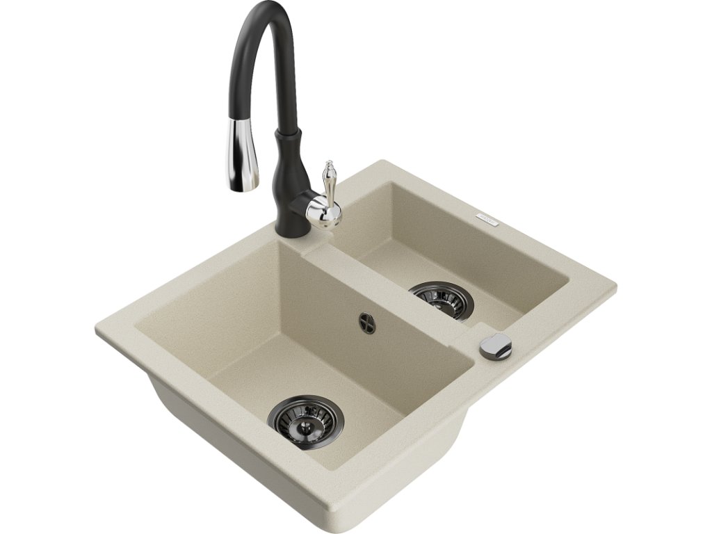 Granitový drez Mexen Carlos s 1,5 miskou a kuchynskou batériou Savita, béžový - 6518-69-672601-70