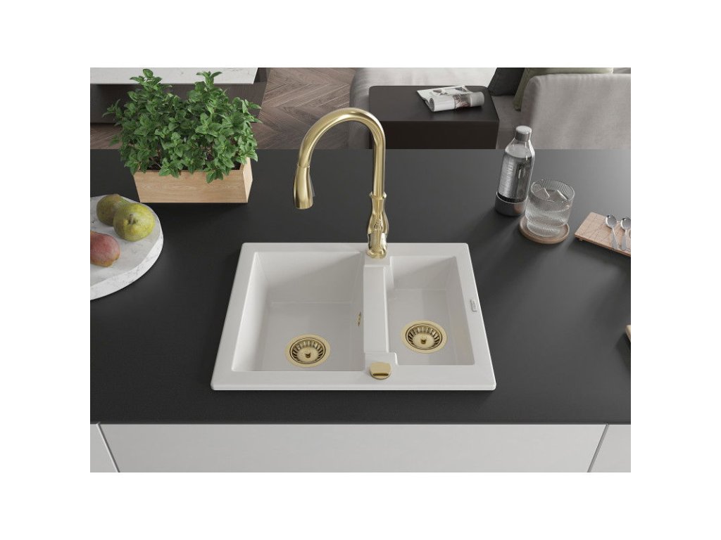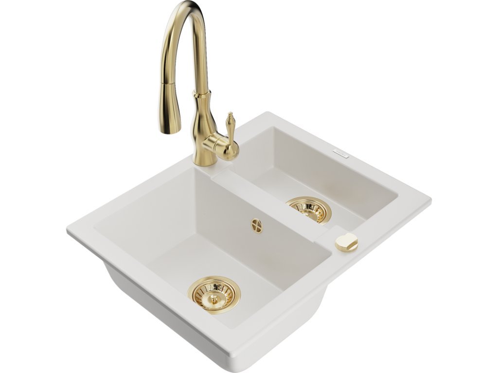 Granitový drez Mexen Carlos s 1,5 miskou a kuchynskou batériou Savita, biely - 6518-20-672601-50