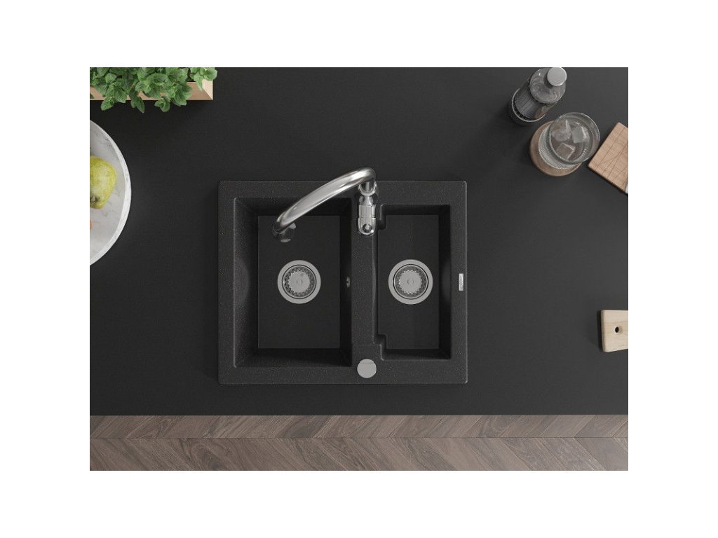 Granitový drez Mexen Carlos s 1,5 miskou a kuchynskou batériou Savita, čierna/strieborná metalíza - 6518-71-672601-71
