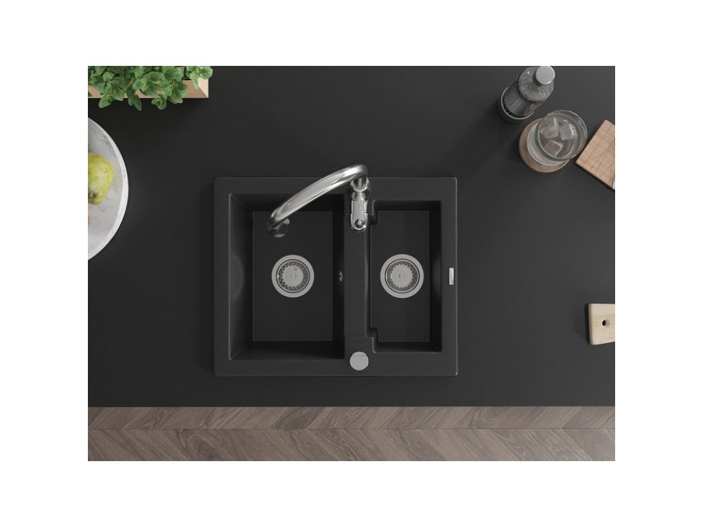 Granitový drez Mexen Carlos s 1,5 miskou a kuchynskou batériou Savita, čierny - 6518-77-672601-00