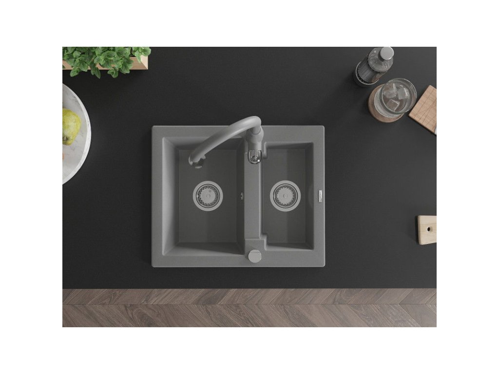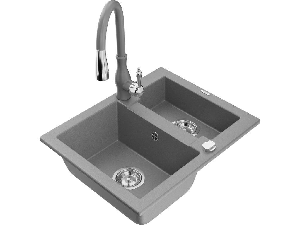 Granitový drez Mexen Carlos s 1,5 miskou a kuchynskou batériou Savita, sivý - 6518-71-672601-71