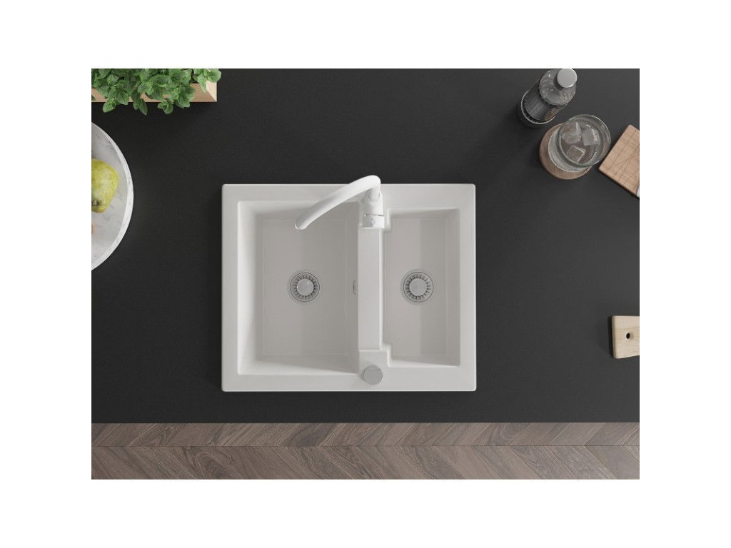 Granitový drez Mexen Carlos s 1,5 miskou a kuchynskou batériou Telma, biely - 6518-20-670200-20