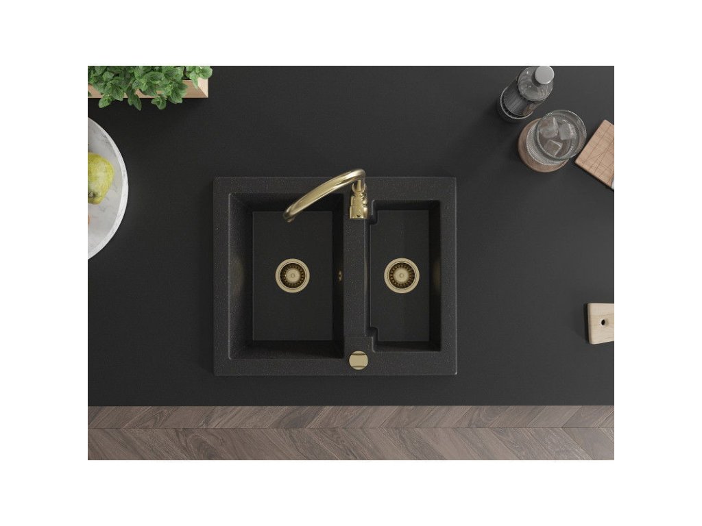 Granitový drez Mexen Carlos s 1,5 miskou a kuchynskou batériou Telma, čierna/strieborná metalíza - 6518-73-670200-50