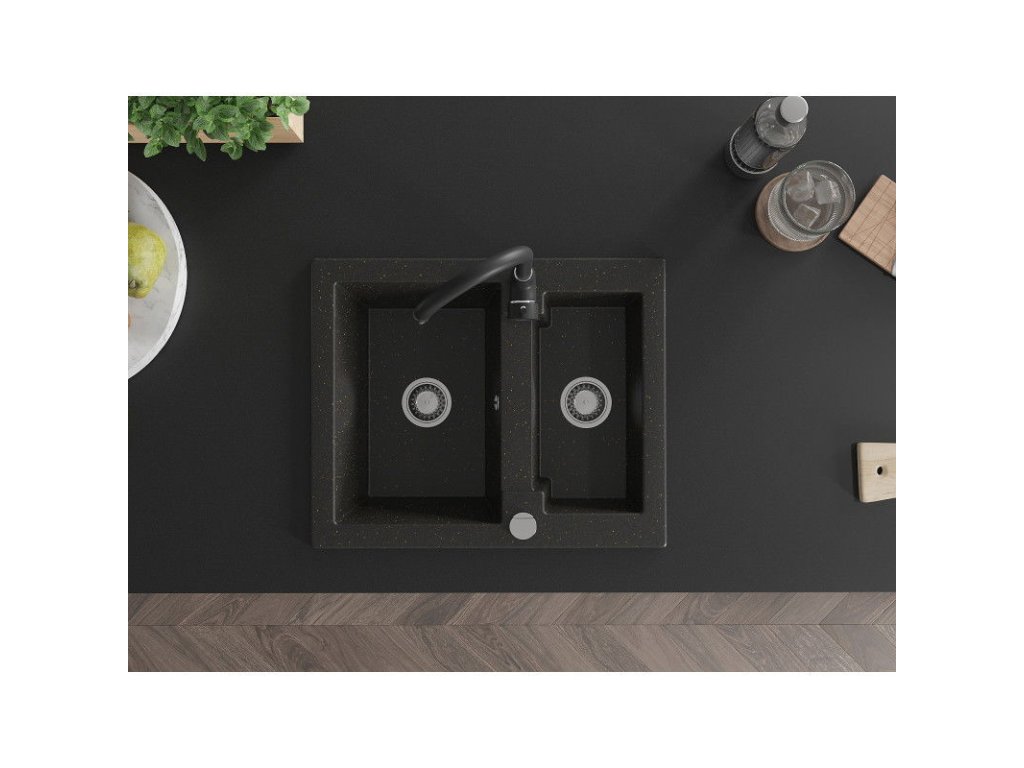 Granitový drez Mexen Carlos s 1,5 miskou a kuchynskou batériou Telma, čierna/zlatá metalíza - 6518-75-670200-70
