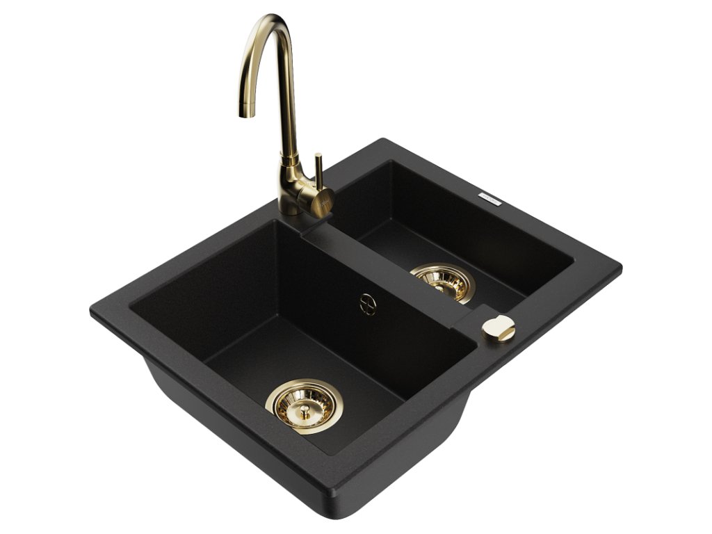 Granitový drez Mexen Carlos s 1,5 miskou a kuchynskou batériou Telma, čierny - 6518-77-670200-50