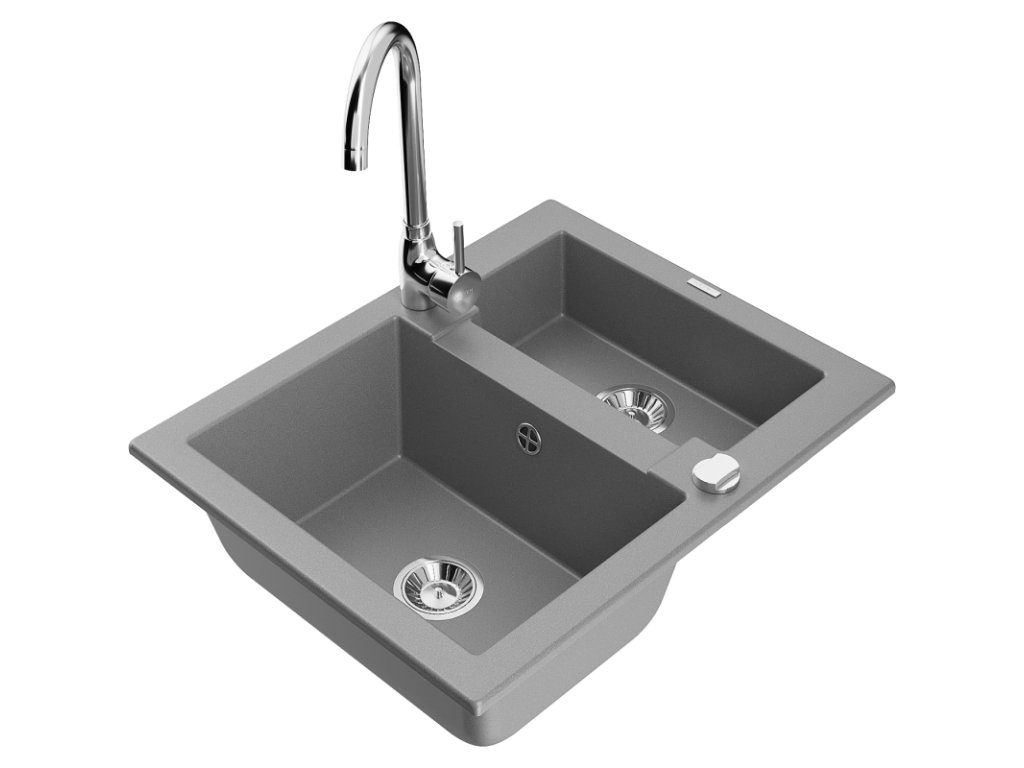 Granitový drez Mexen Carlos s 1,5 miskou a kuchynskou batériou Telma, sivý - 6518-71-670200-00