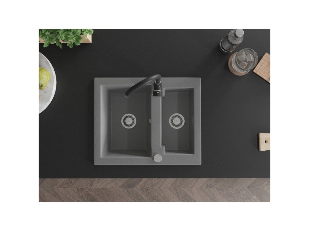 Granitový drez Mexen Carlos s 1,5 miskou a kuchynskou batériou Telma, sivý - 6518-71-670200-70