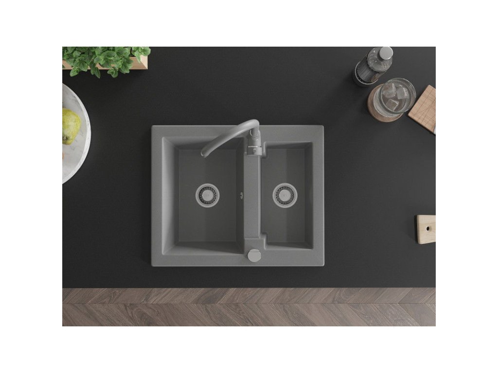 Granitový drez Mexen Carlos s 1,5 miskou a kuchynskou batériou Telma, sivý - 6518-71-670200-71