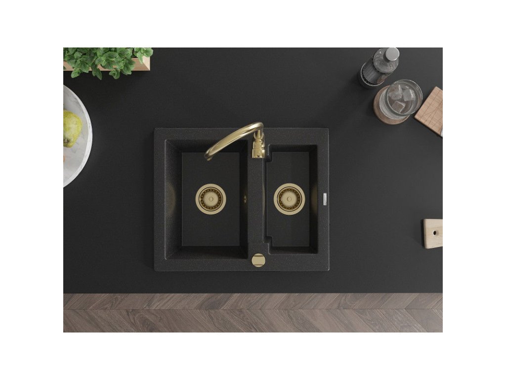 Granitový drez Mexen Carlos s 1,5 misky 582 x 475 mm, čierna/strieborná metalíza, zlatý sifón - 6518581500-73-G