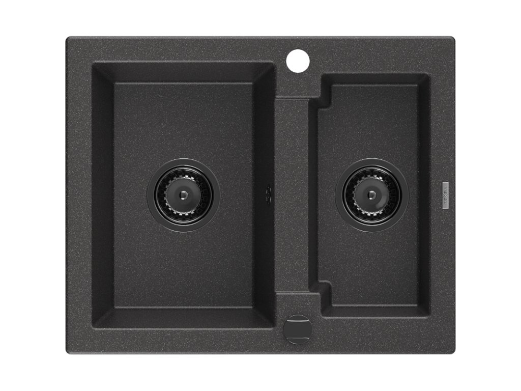 Granitový drez Mexen Carlos s 1,5 misky 582 x 475 mm, čierny bodkovaný, čierny sifón - 6518581500-76-B