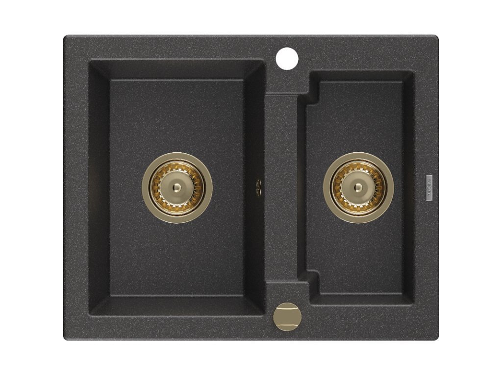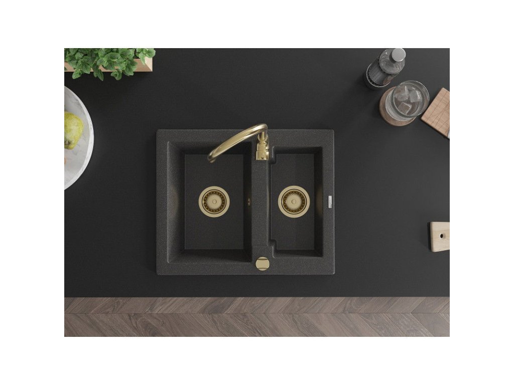 Granitový drez Mexen Carlos s 1,5 misky 582 x 475 mm, čierny bodkovaný, zlatý sifón - 6518581500-76-G