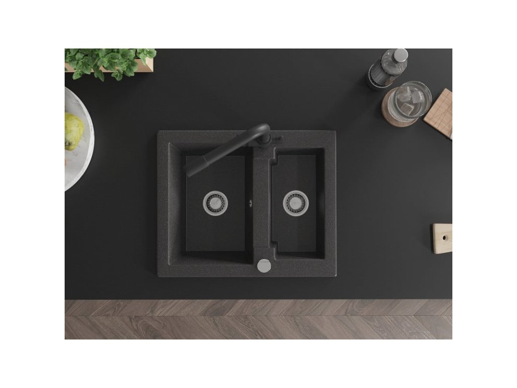 Granitový drez Mexen Carlos s 1,5 misky a kuchynskou batériou Duero, čierna škvrnitá - 6518-76-671600-70