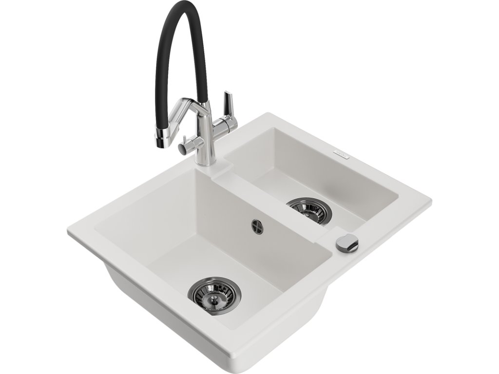 Granitový drez Mexen Carlos s 1,5 misky a kuchynskou batériou Duo, biely - 6518-20-671701-07-B