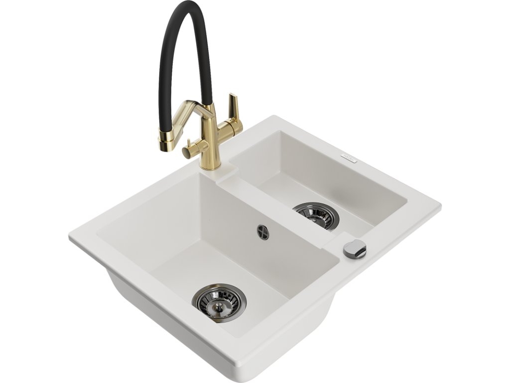 Granitový drez Mexen Carlos s 1,5 misky a kuchynskou batériou Duo, biely - 6518-20-671701-57-B
