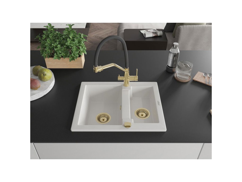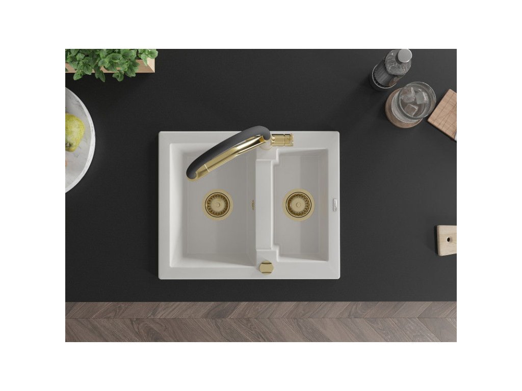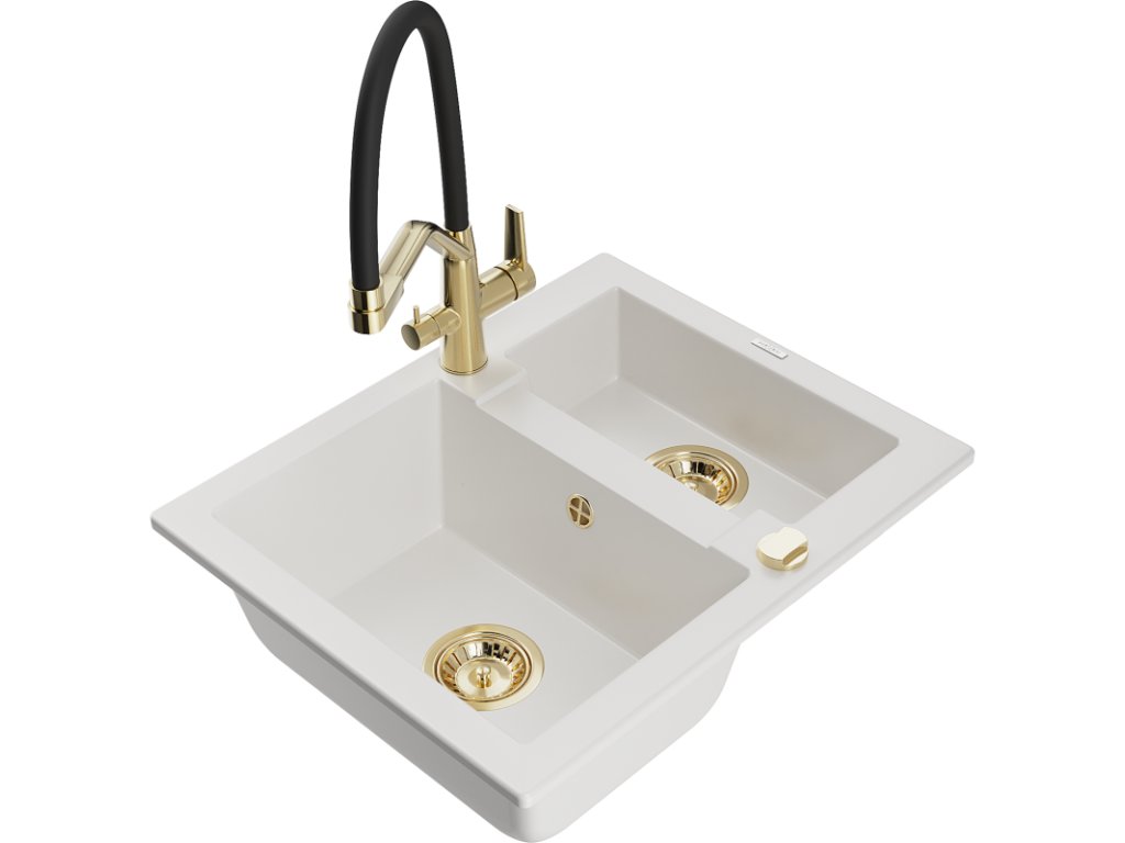 Granitový drez Mexen Carlos s 1,5 misky a kuchynskou batériou Duo, biely - 6518-20-671701-57-G