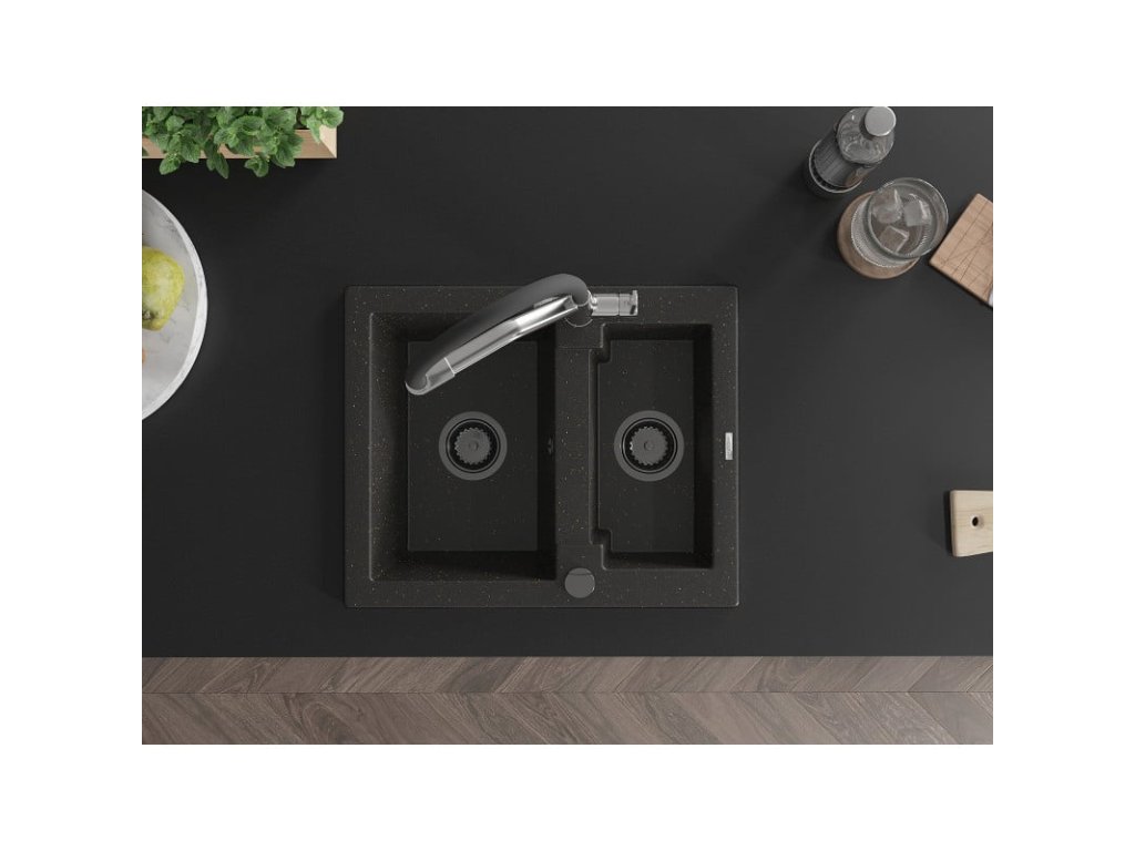 Granitový drez Mexen Carlos s 1,5 misky a kuchynskou batériou Duo, čierna/zlatá metalíza - 6518-75-671701-07-B