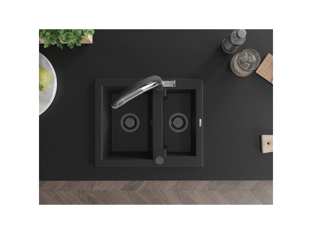 Granitový drez Mexen Carlos s 1,5 misky a kuchynskou batériou Duo, čierny - 6518-77-671701-07-B