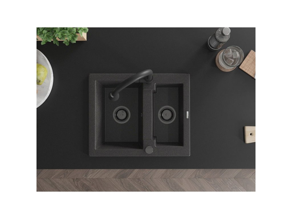 Granitový drez Mexen Carlos s 1,5 misky a kuchynskou batériou Elia, čierna škvrnitá - 6518-76-670101-70-B