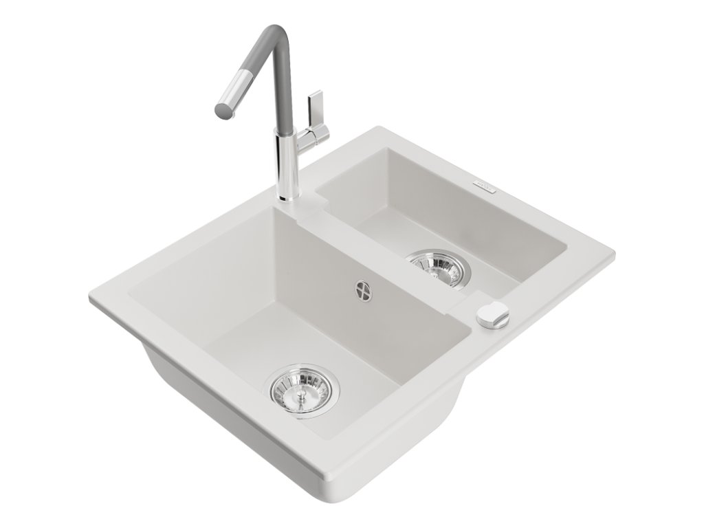 Granitový drez Mexen Carlos s 1,5 misky a kuchynskou batériou Flora, biely - 6518-20-670401-06