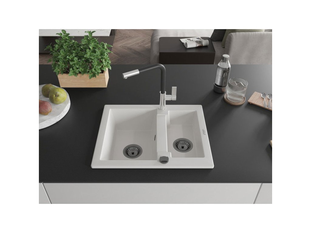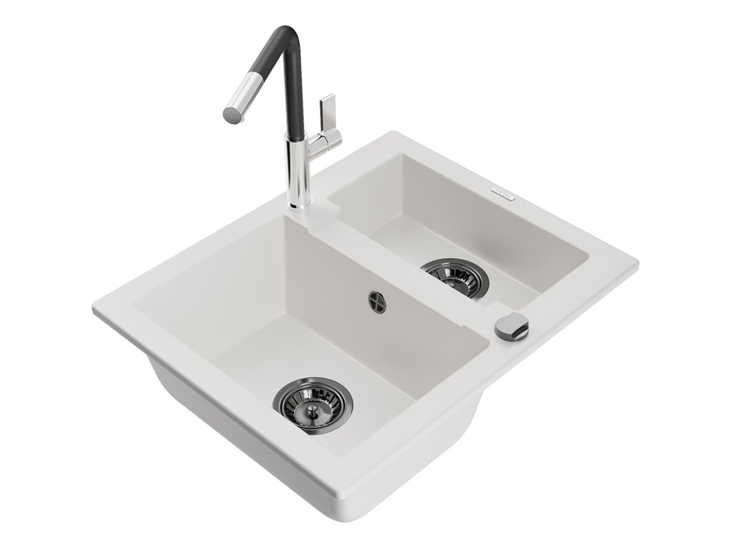 Granitový drez Mexen Carlos s 1,5 misky a kuchynskou batériou Flora, biely - 6518-20-670401-07-B