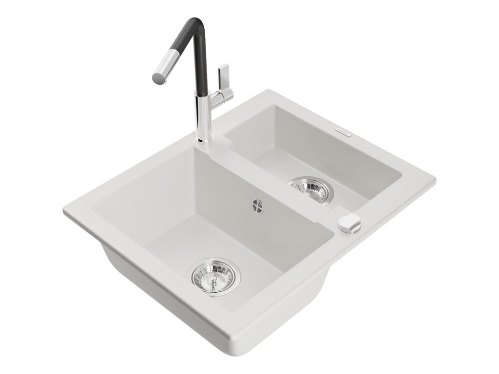 Granitový drez Mexen Carlos s 1,5 misky a kuchynskou batériou Flora, biely - 6518-20-670401-07