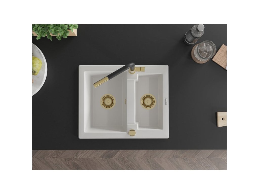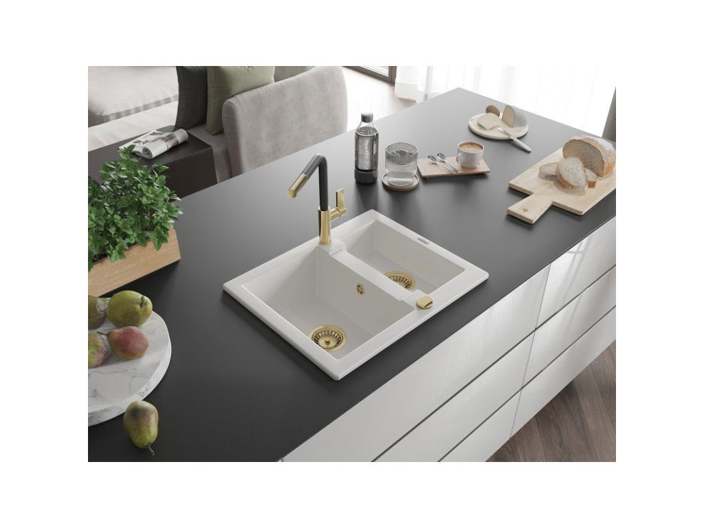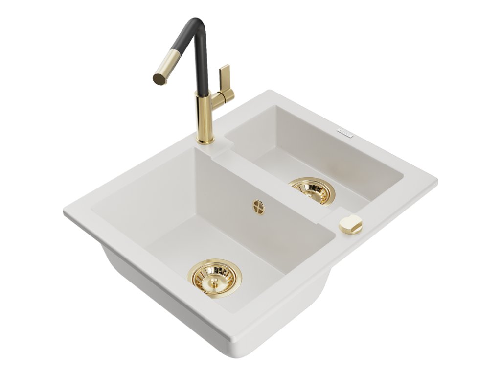 Granitový drez Mexen Carlos s 1,5 misky a kuchynskou batériou Flora, biely - 6518-20-670401-57-G