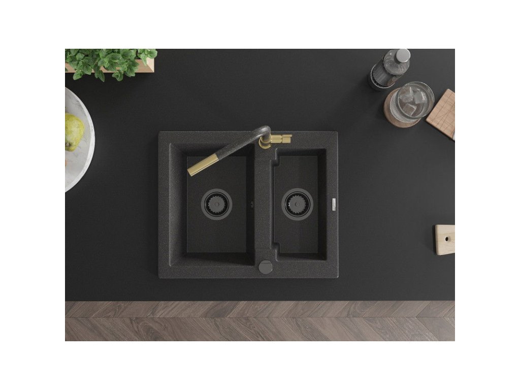 Granitový drez Mexen Carlos s 1,5 misky a kuchynskou batériou Flora, škvrnitá čierna - 6518-76-670401-75-B