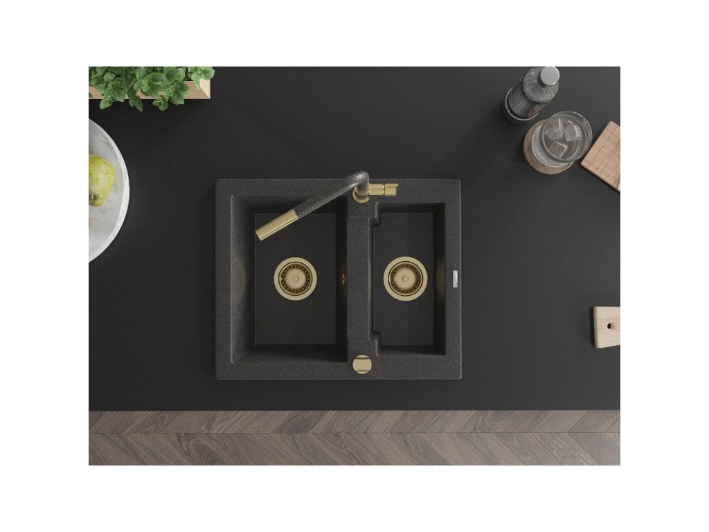 Granitový drez Mexen Carlos s 1,5 misky a kuchynskou batériou Flora, škvrnitá čierna - 6518-76-670401-75-G