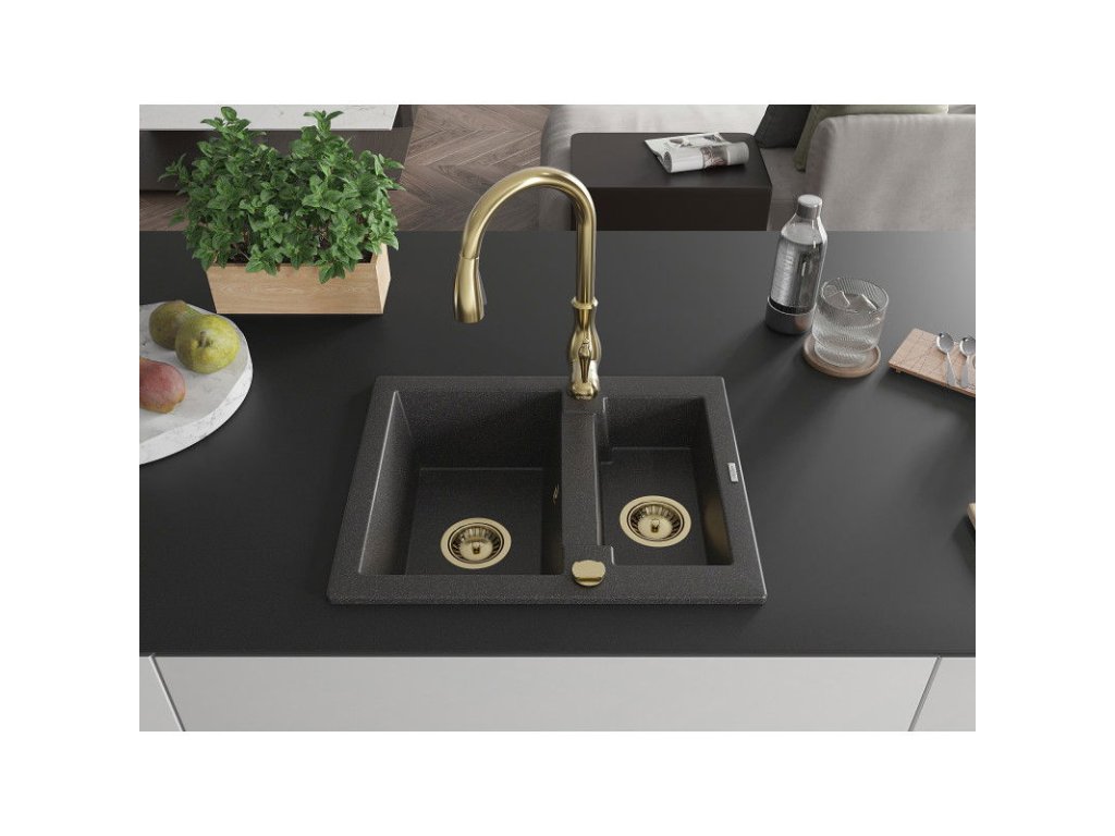 Granitový drez Mexen Carlos s 1,5 misky a kuchynskou batériou Savita, čierna škvrnitá - 6518-76-672601-50