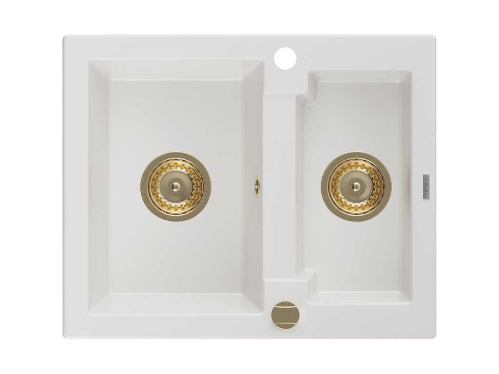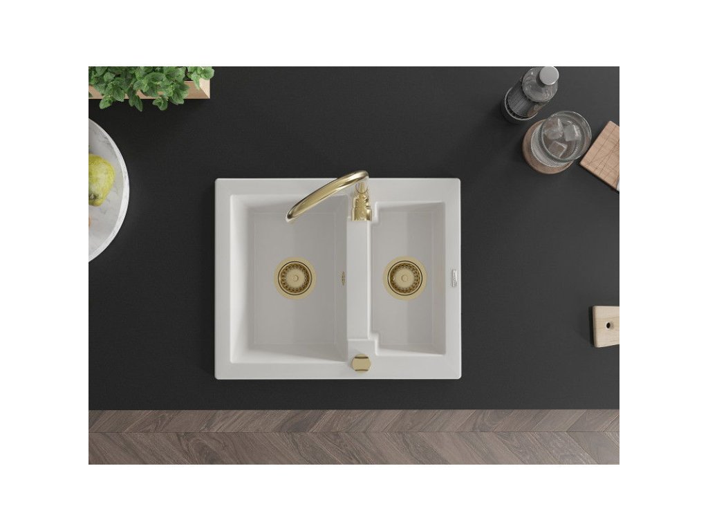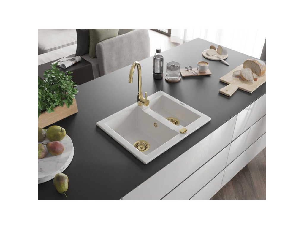 Granitový drez Mexen Carlos s 1,5 misou 582 x 475 mm, biely, zlatý sifón - 6518581500-20-G