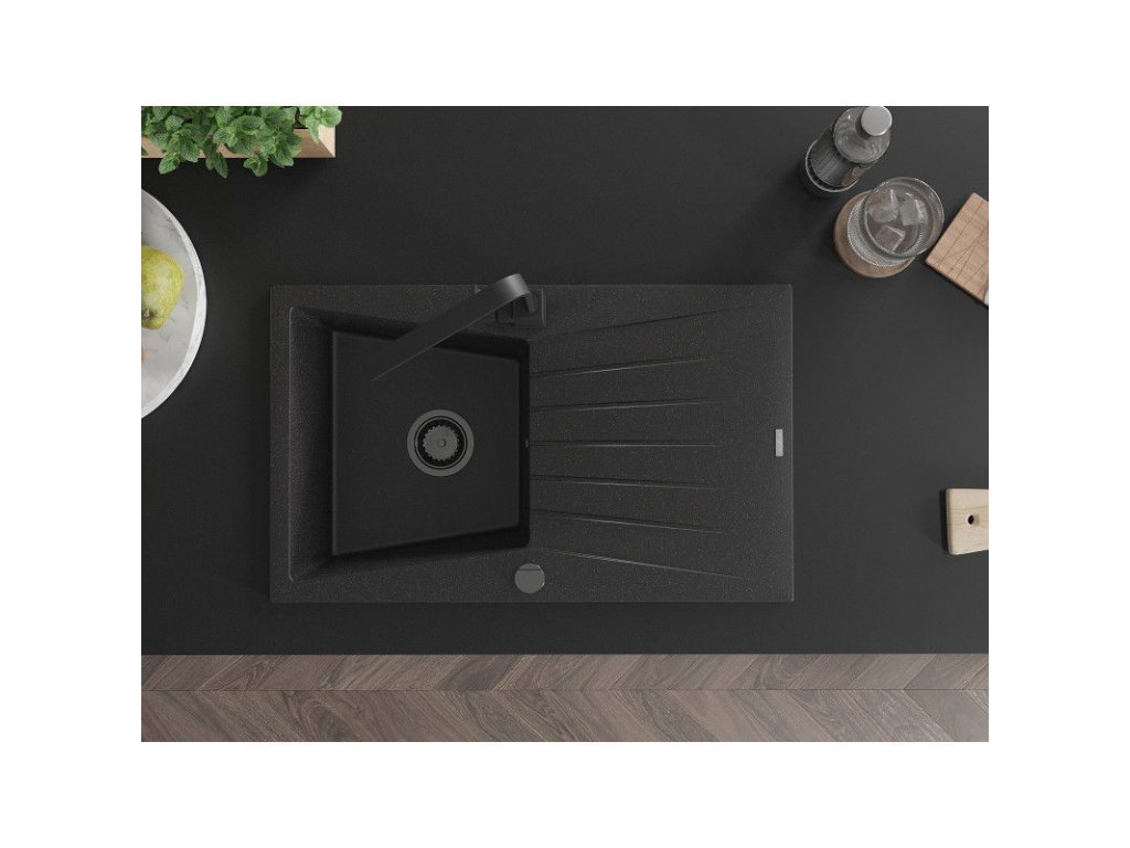 Granitový drez Mexen Cesar s 1 misou, odkapávačom a batériou Rita, čierna/strieborná metalíza - 6514-73-670300-70-B