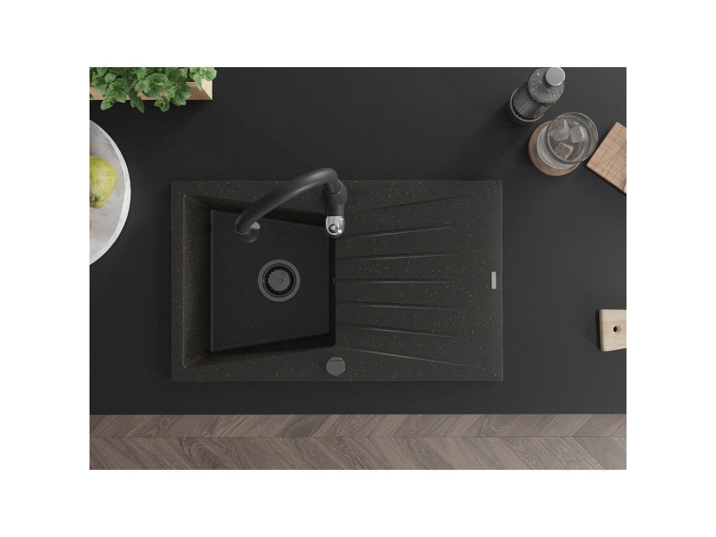Granitový drez Mexen Cesar s 1 misou, odkapávačom a batériou Savita, čierna/zlatá metalíza - 6514-75-672601-70-B