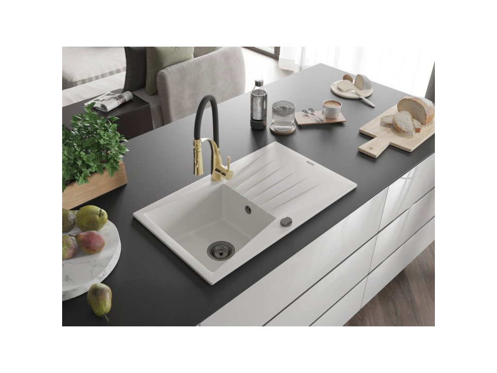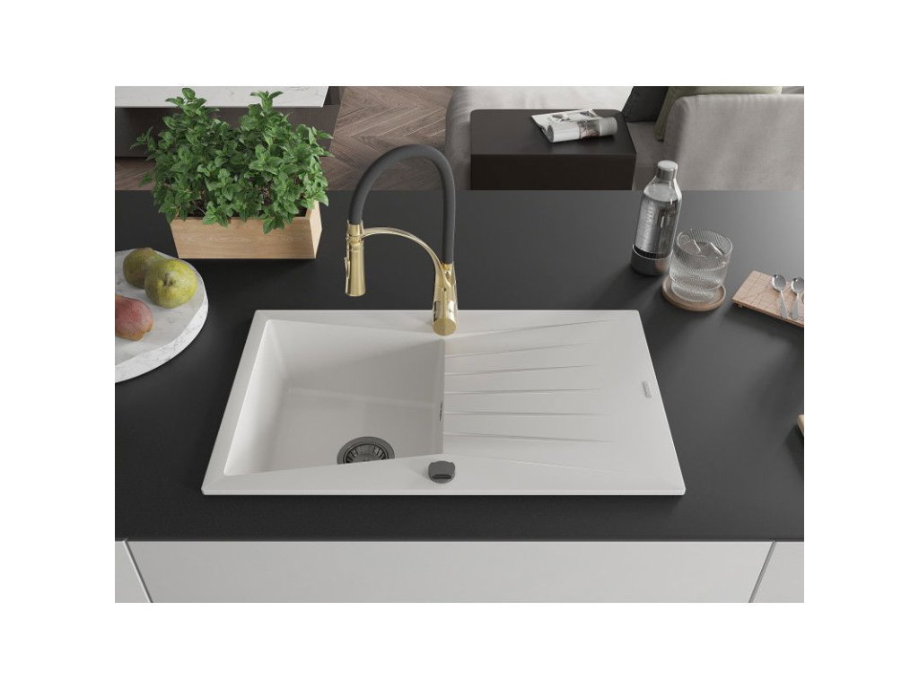 Granitový drez Mexen Cesar s 1 misou, odkapávačom a kuchynskou batériou Aster, biely - 6514-20-73450-57-B