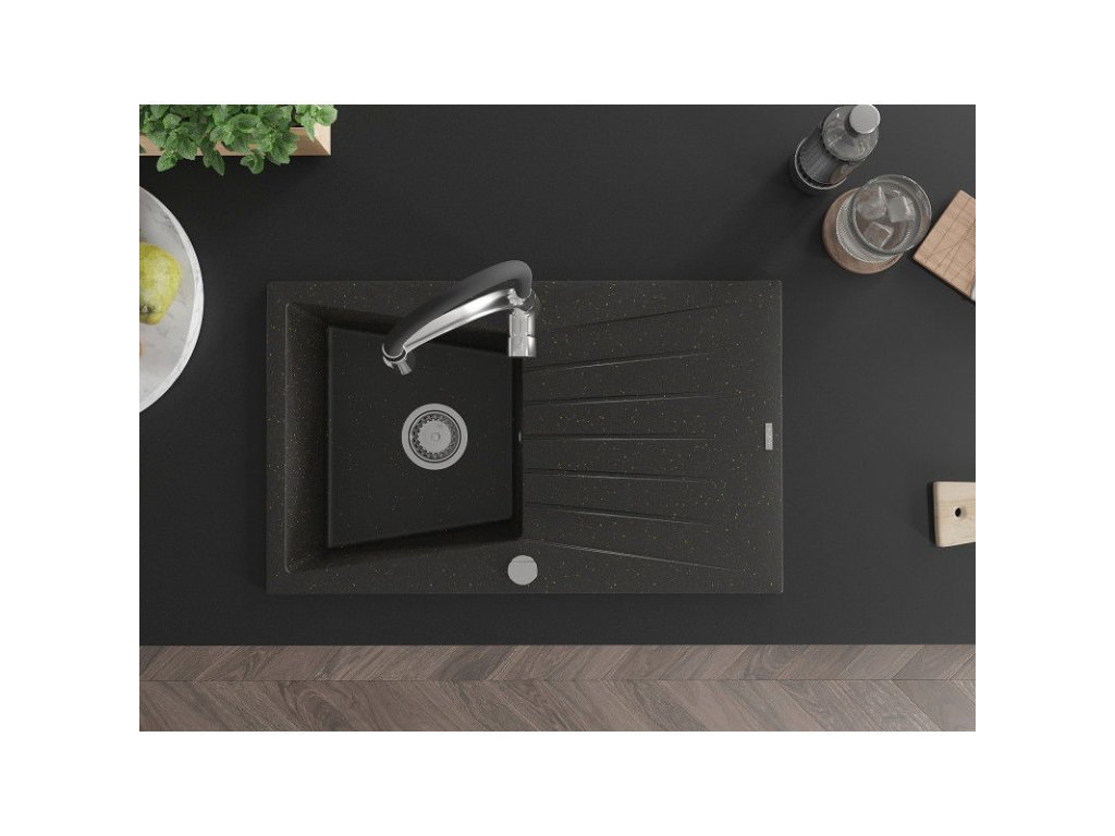 Granitový drez Mexen Cesar s 1 misou, odkapávačom a kuchynskou batériou Aster, čierna/zlatá metalíza - 6514-75-73450-07