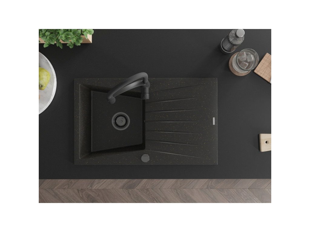 Granitový drez Mexen Cesar s 1 misou, odkapávačom a kuchynskou batériou Aster, čierna/zlatá metalíza - 6514-75-73450-70-B
