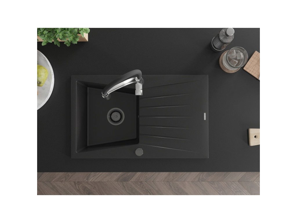 Granitový drez Mexen Cesar s 1 misou, odkapávačom a kuchynskou batériou Aster, čierny - 6514-77-73450-07-B
