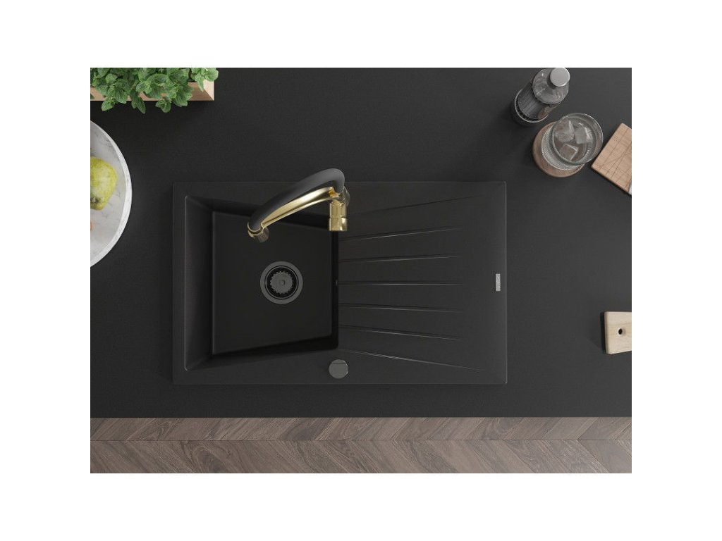 Granitový drez Mexen Cesar s 1 misou, odkapávačom a kuchynskou batériou Aster, čierny - 6514-77-73450-57-B