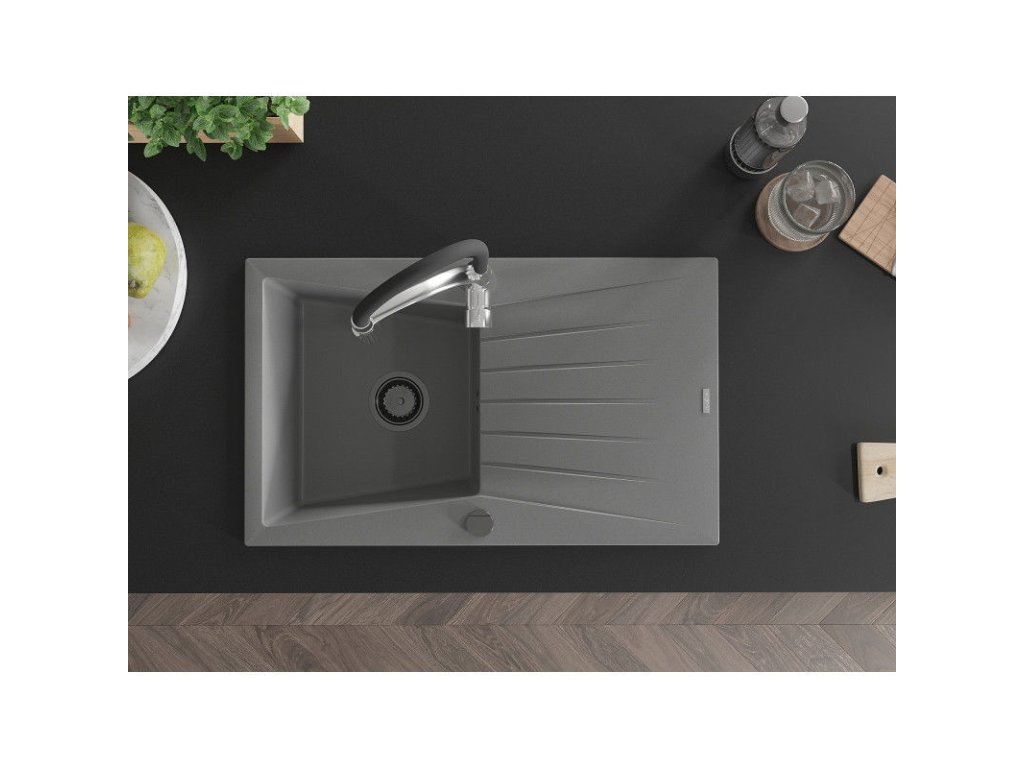 Granitový drez Mexen Cesar s 1 misou, odkapávačom a kuchynskou batériou Aster, sivý - 6514-71-73450-07-B